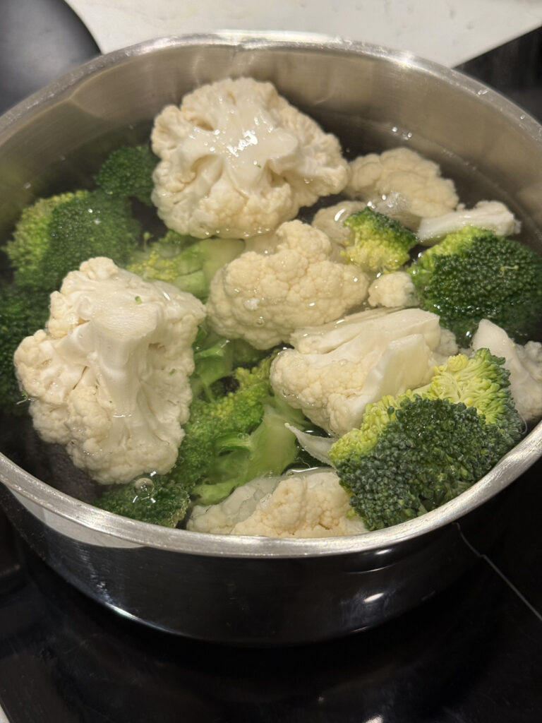 Bring a large pan of salted water to the boil. Parboil the potatoes for 6–8 minutes until just tender but not falling apart. Add the broccoli and cauliflower for the final 2 minutes, then drain everything well.