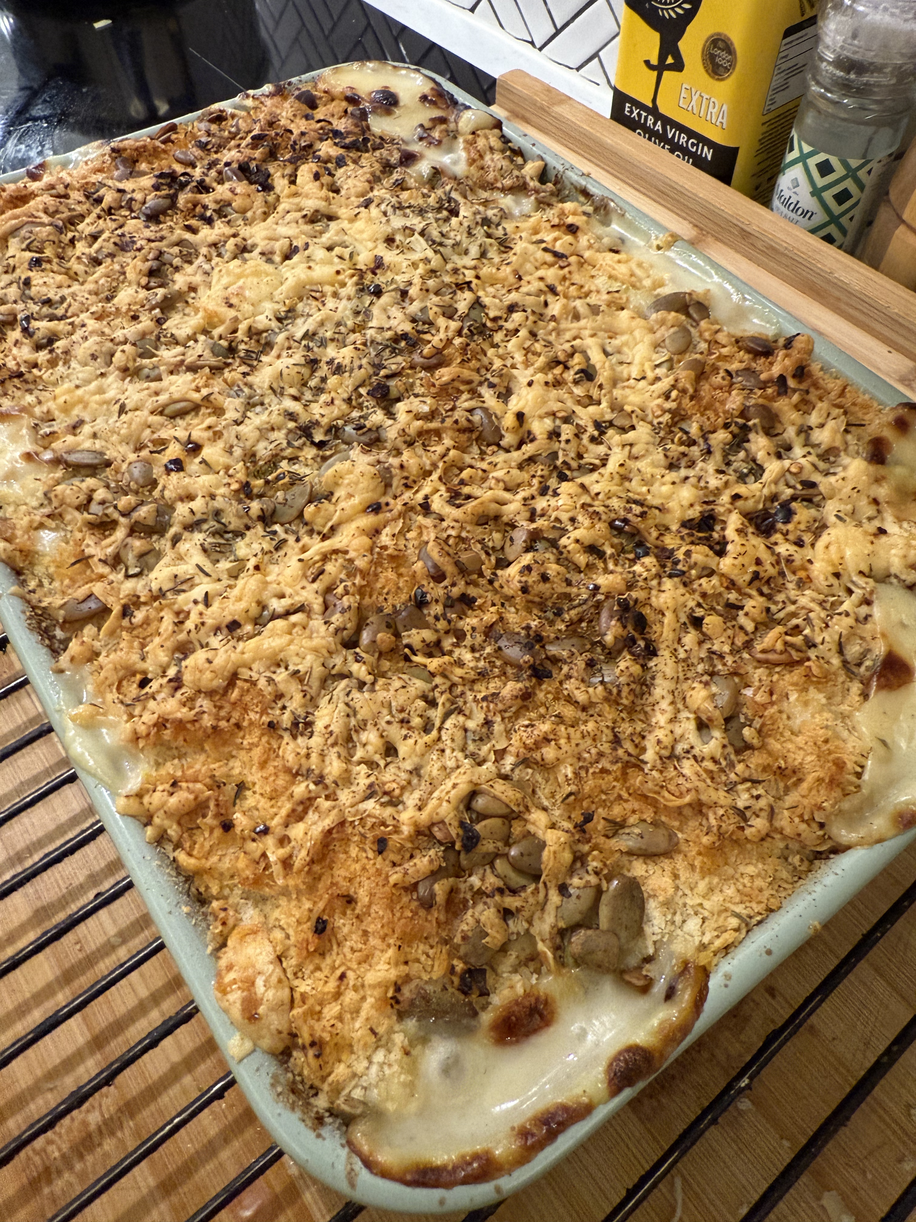 I made this version using leeks, peas, potatoes, broccoli, and cauliflower, but this is very much a use-what-you-have recipe. It’s designed to be flexible, forgiving, and perfect for clearing out the veg drawer while still delivering big flavour. The wholegrain mustard adds depth to the cheese béchamel, the herbs lift the richness, and the panko breadcrumb topping gives that all-important crunch.
