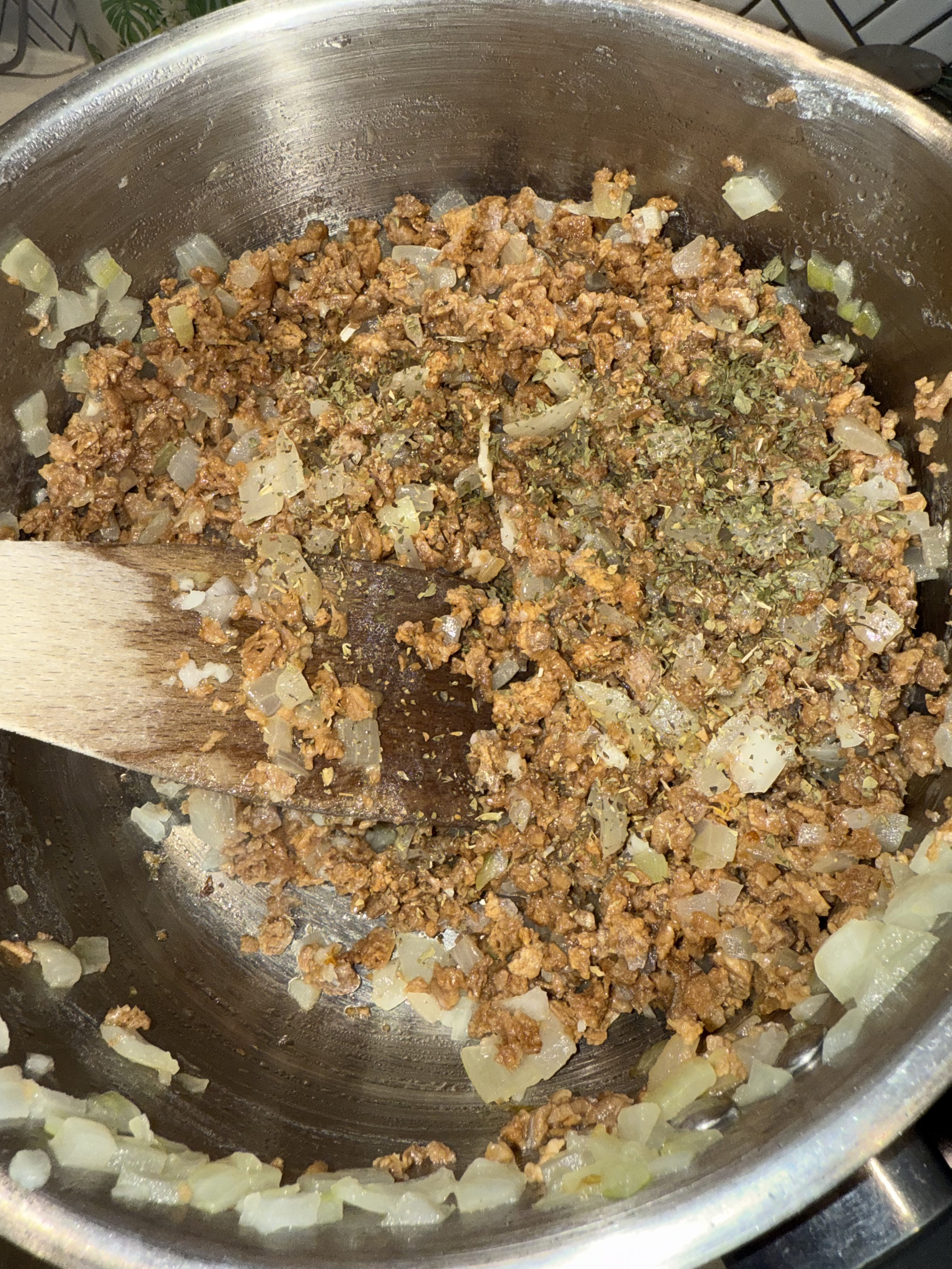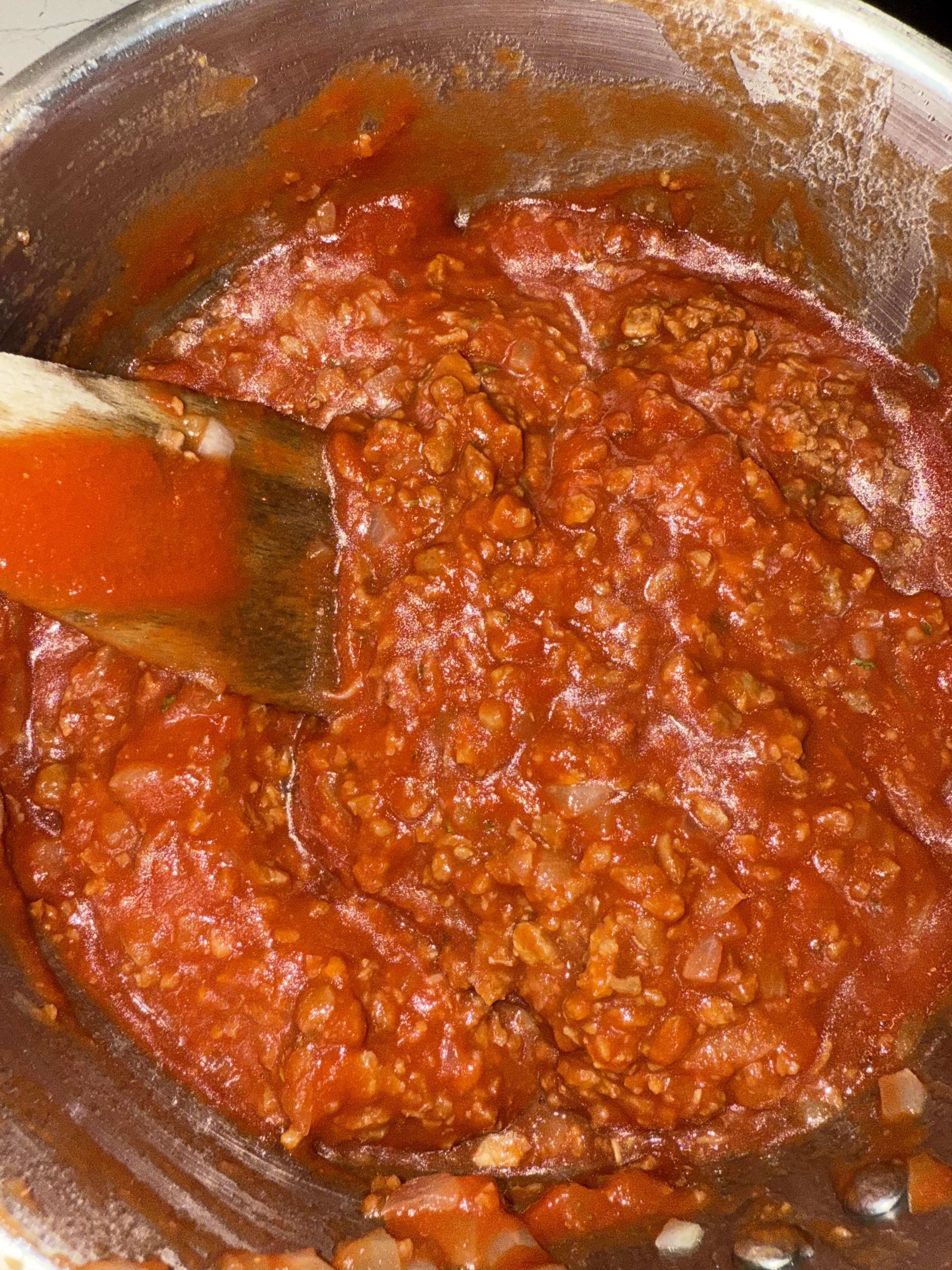 Stir in the veggie mince (or meat mince) and cook for around 5 minutes until browned (longer if using raw meat). - Build the sauce: