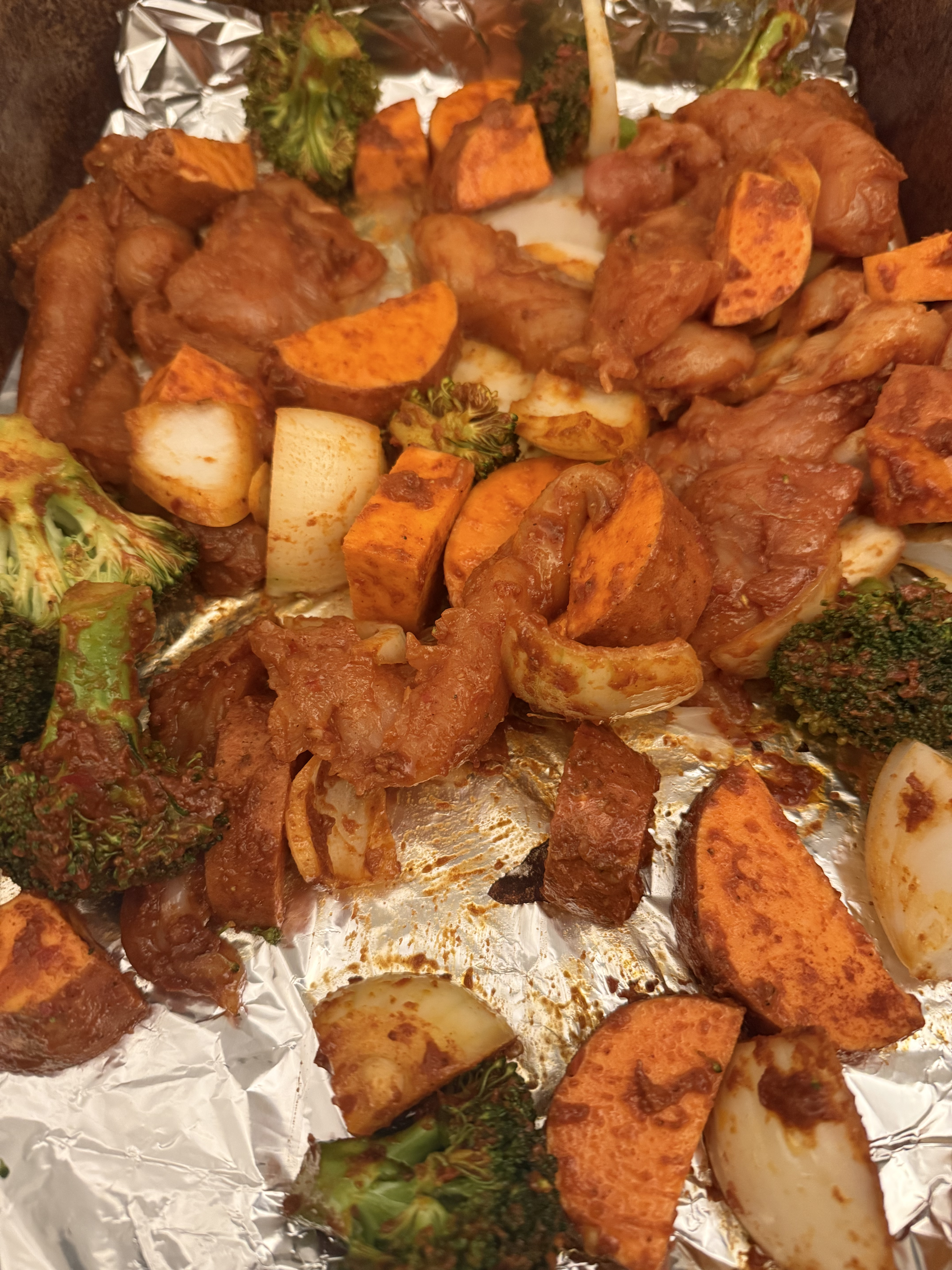 Spread everything out into an even layer — overcrowding stops proper roasting. - Roast
